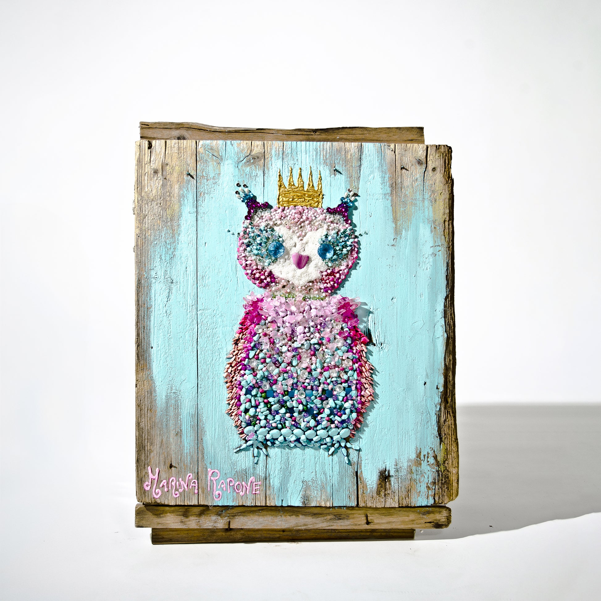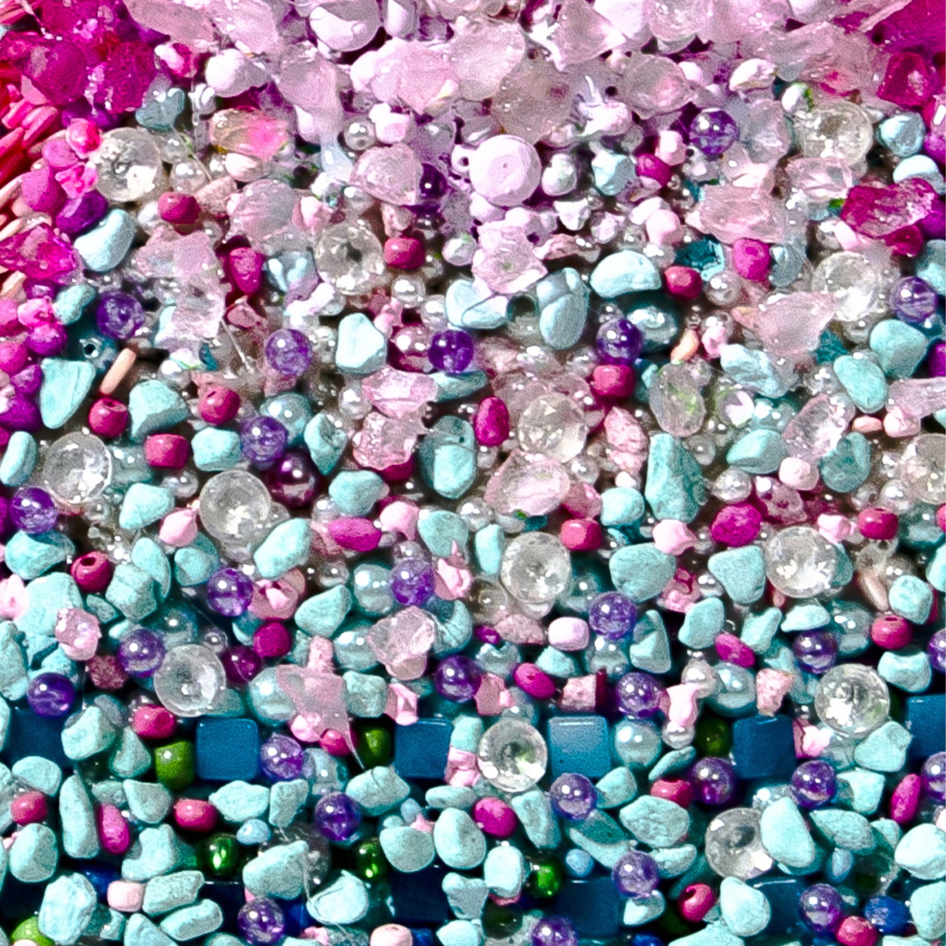 Sabbia, sassolini colorati, Swarovski e perline su legno.